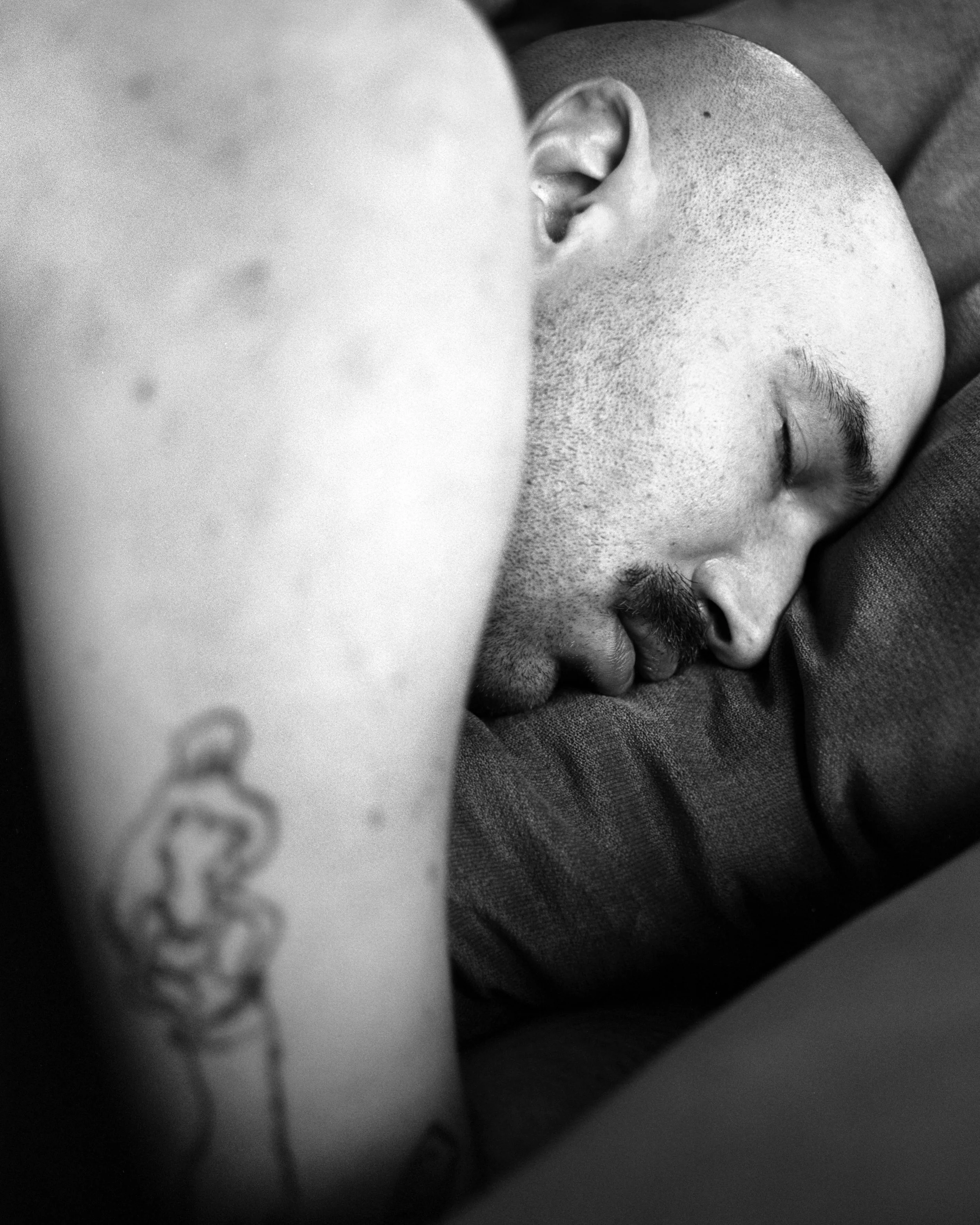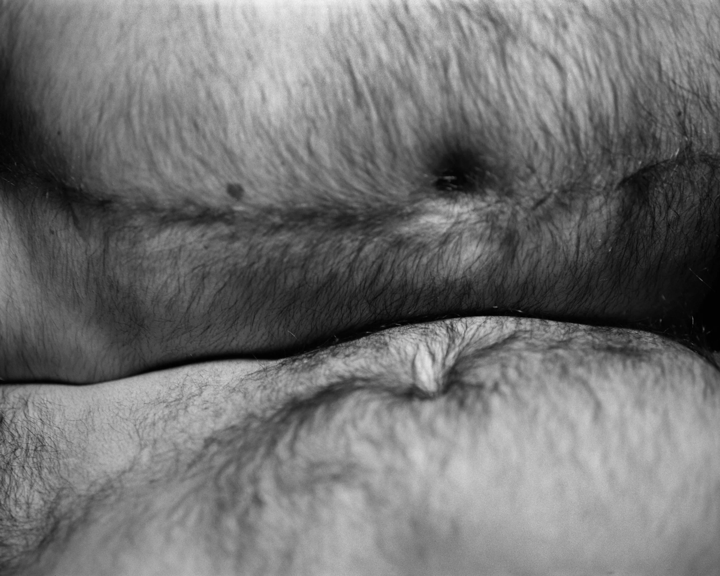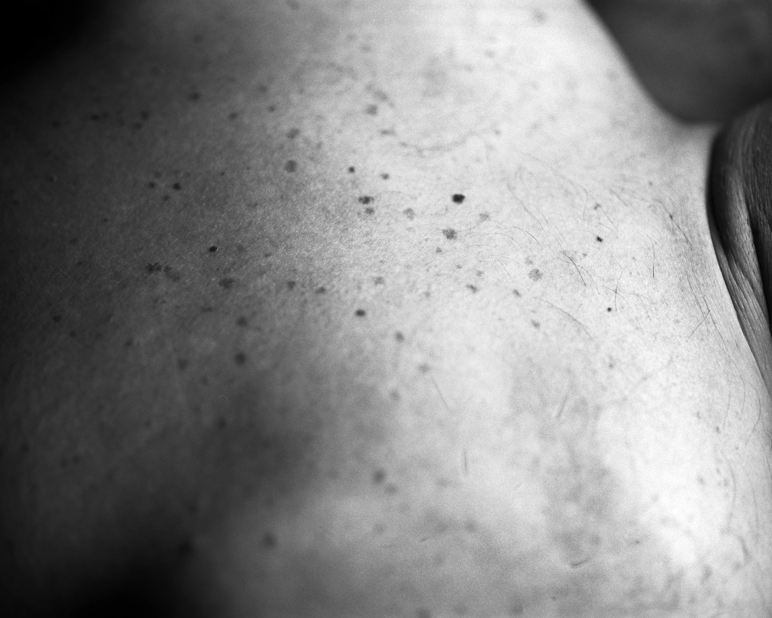 Detail shots of Omar. I’ve become very taken by his stretch marks and how they seem to catch light differently—more eager to reflect than the rest of his body. I use these later on to push the limitations of the film grain and blow them up to almost over-examine these traits.
